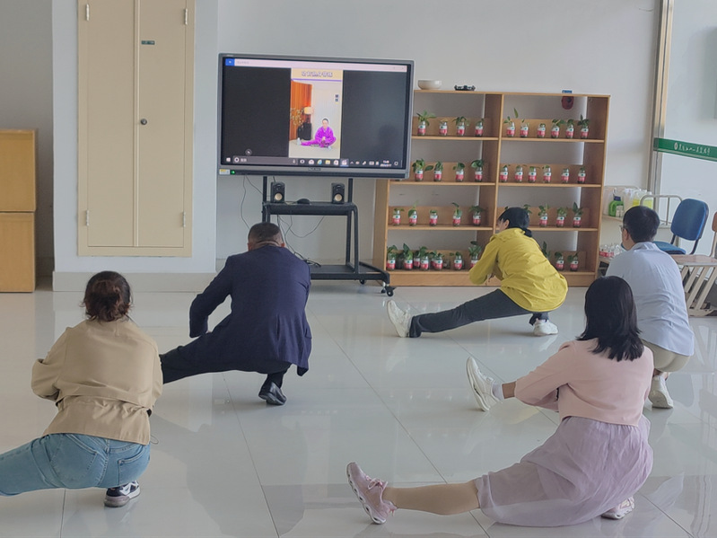 考虑到馆员工作节奏与场地便利性,工会将活动地点选定在一楼北门大厅——这里空间开阔、光线充足,每日上午9:30与下午3:00,这里准时“变身”健身小天地。在舒缓的背景音乐中,馆员们暂时放下手中的工作,跟随大屏幕中的指导动作舒展身体——抬手、转身、屈膝、拉伸,一招一式尽显八段锦的柔和与韵律。作为经典的古法健身操,八段锦无需复杂器械,既能疏通经络、放松肩颈,又能调节呼吸、平复心绪,每一个动作都讲究“形随气走、意与身合”,让馆员在慢节奏中感受身体的放松与舒展。